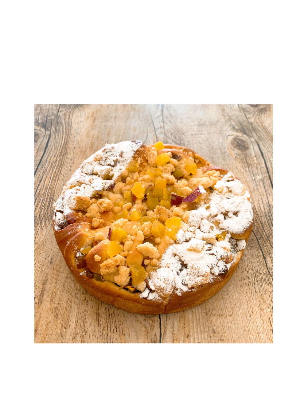 しっとりした自家製スイートポテトフィリングを口どけの良い生地でたっぷりと包み、バターそぼろをトッピングしました。