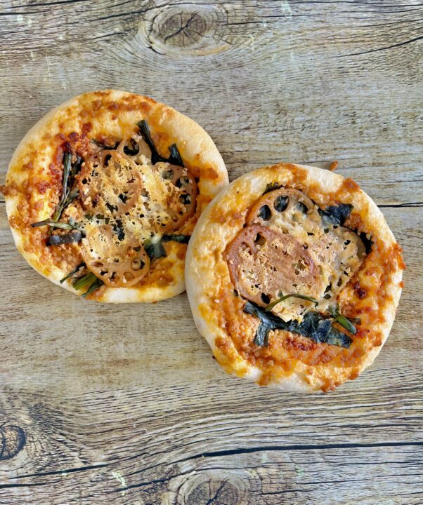 牛乳を含んだ柔らかい生地に、自家製の肉みそとシャキシャキのレンコン・チーズ・にらをトッピングし、チヂミ風に仕上げた惣菜パン!