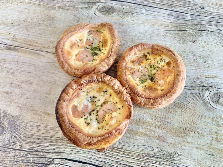 クロワッサン生地にプリップリのエビと淡路島玉ねぎが入ったキッシュです。