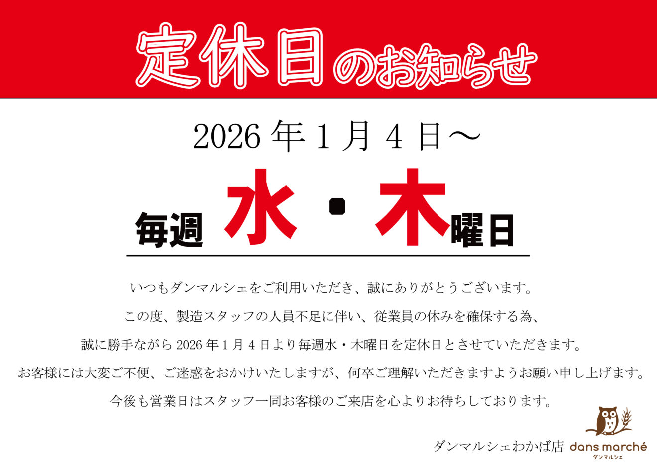 この度、ダンマルシェわかば店では2026年1月より、定休日を毎週水曜日・木曜日の2日間とさせていただくことになりました。
