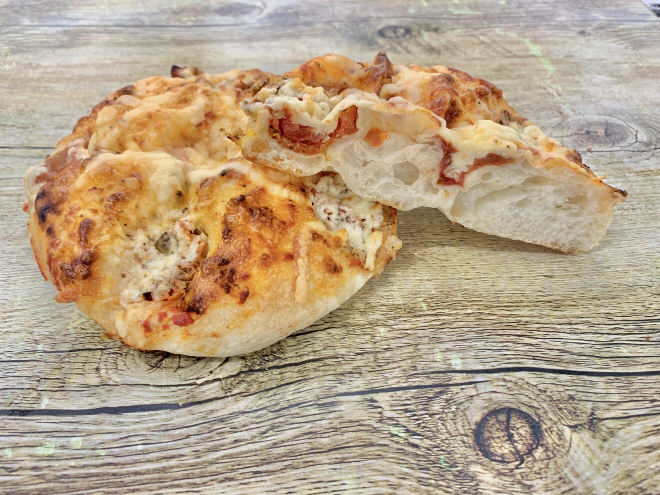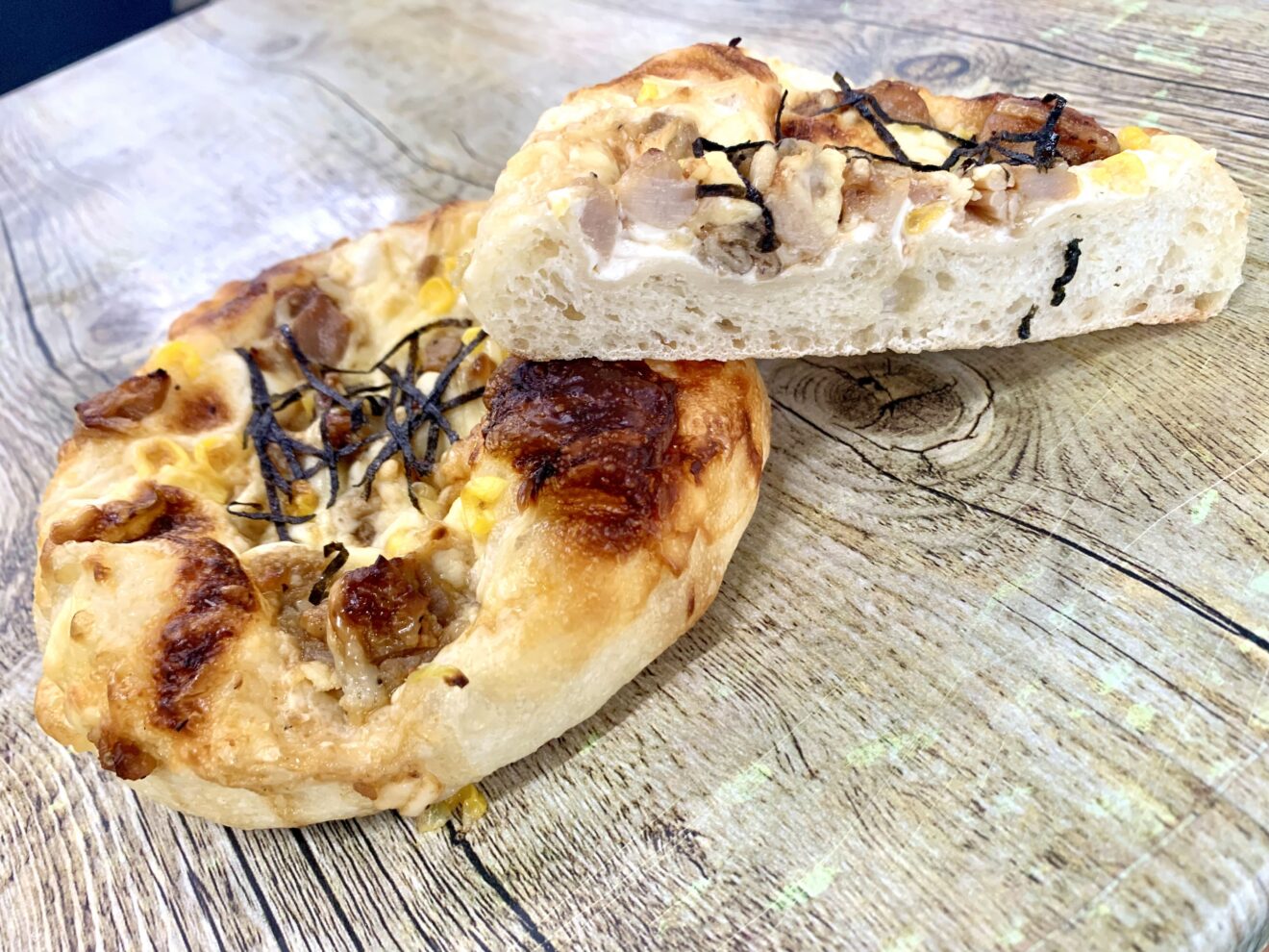 ドライトマトとたっぷりのチーズをのせて焼き上げました。玉ねぎチーズがアクセント!