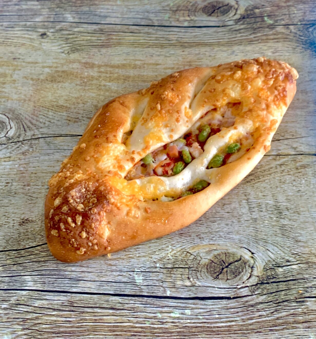 枝豆とベーコンをたっぷりトッピングし、ピザソースで味付けしたフランス伝統の木の葉型パン。